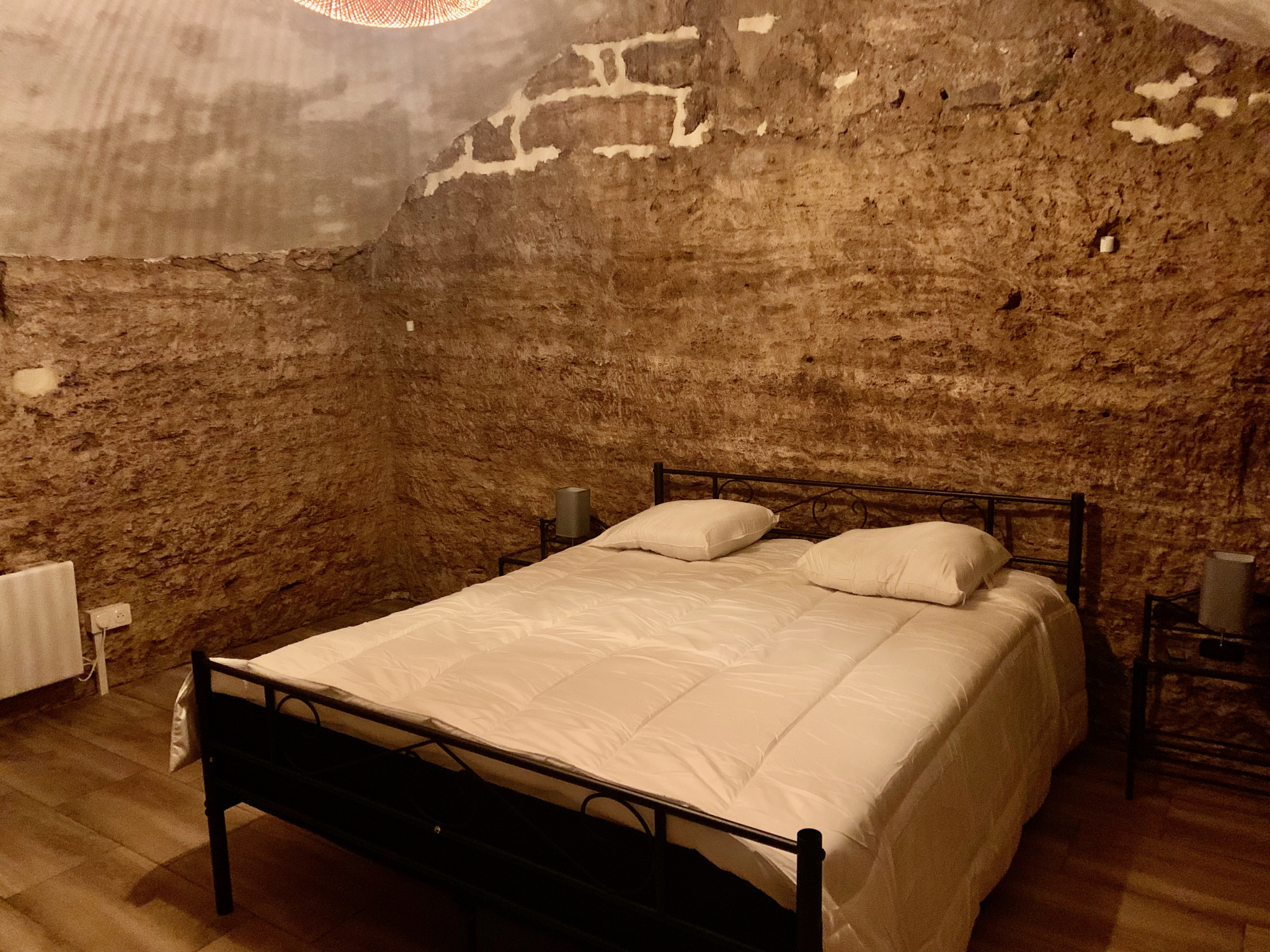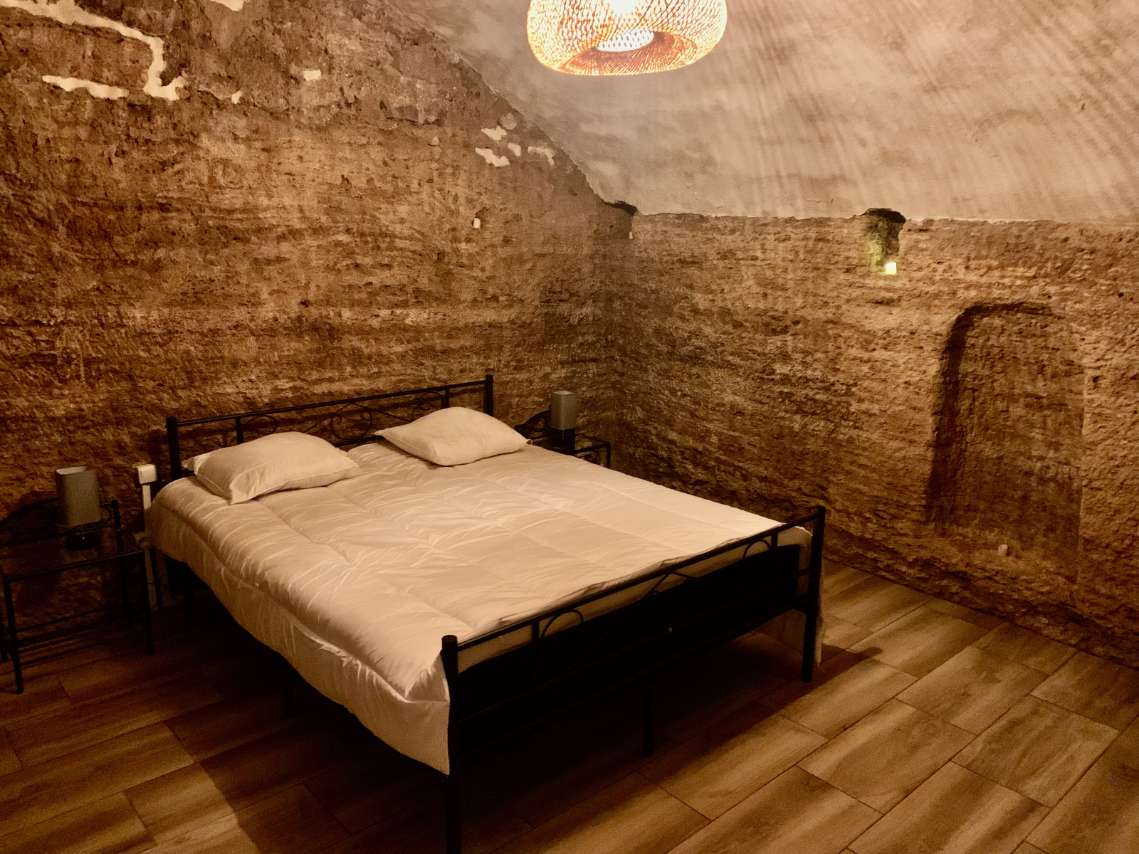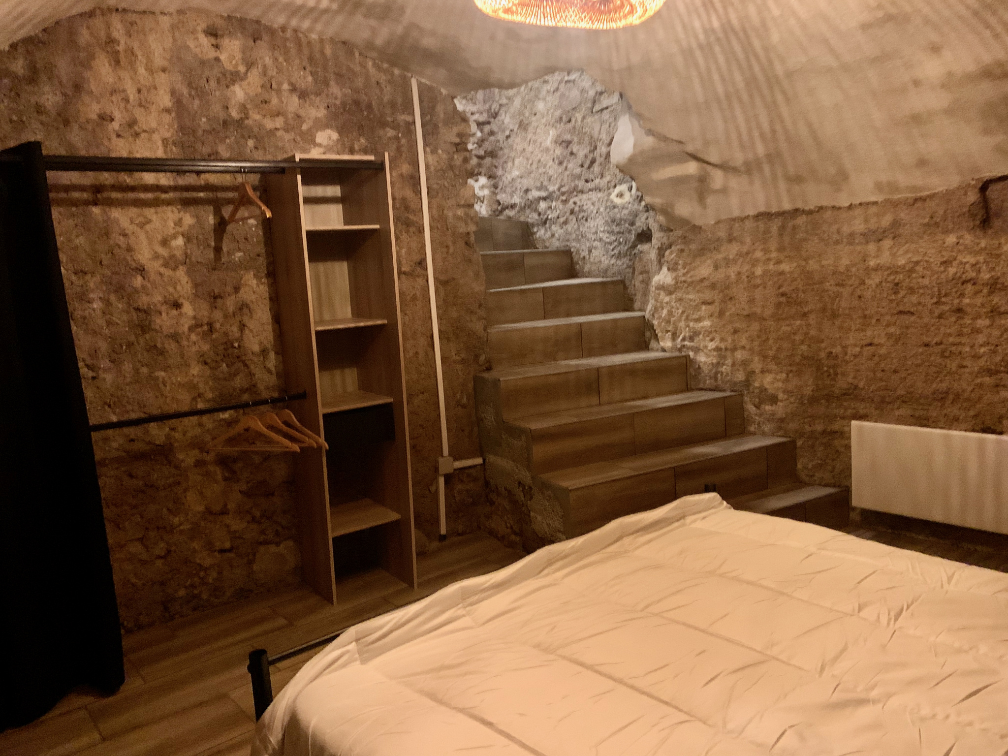 Espace nuit indépendant en sous-sol (14 m² – non comptés dans la surface habitable), niché directement dans la roche, offrant une ambiance cosy et plafond vouté exceptionnel