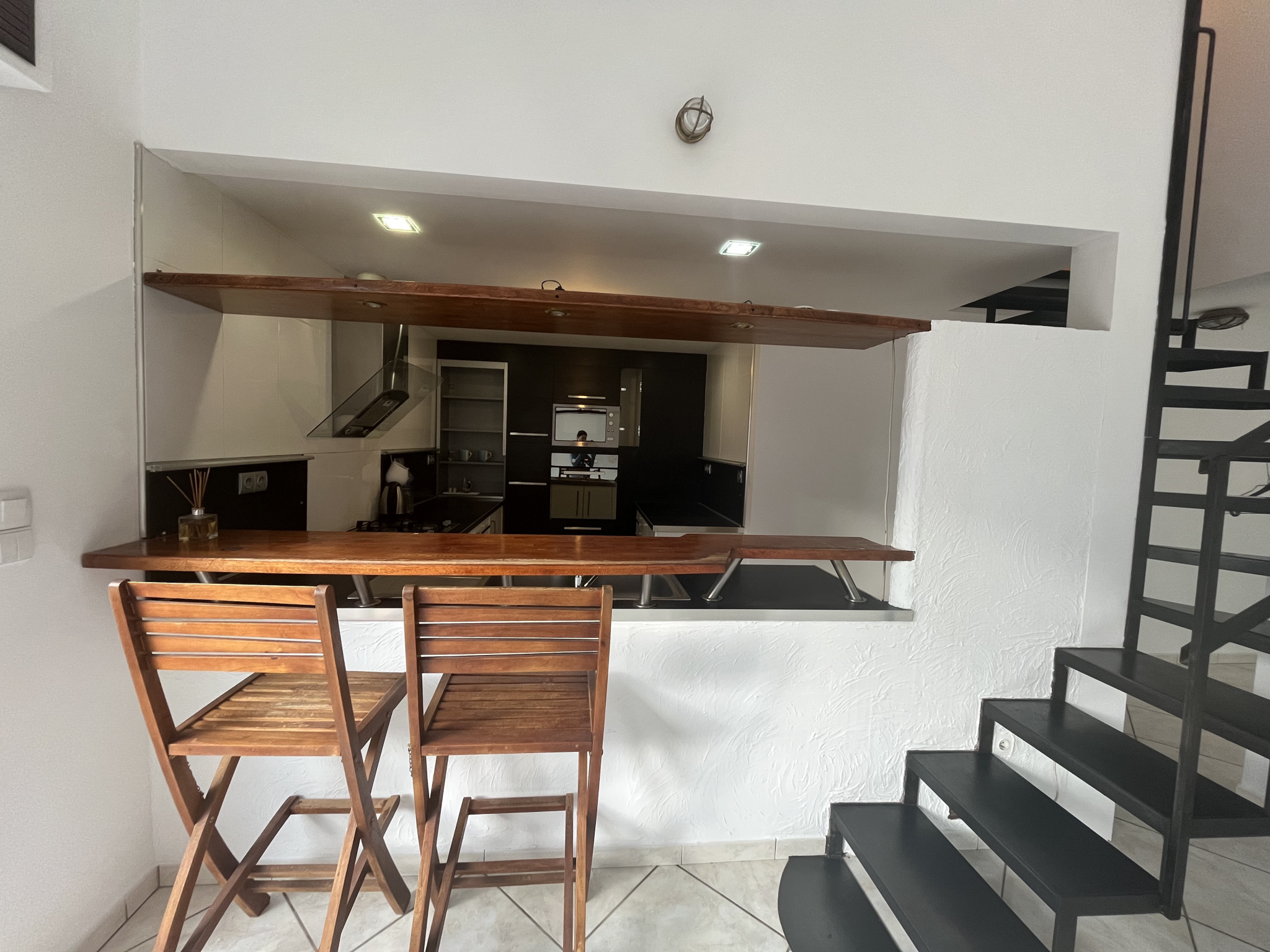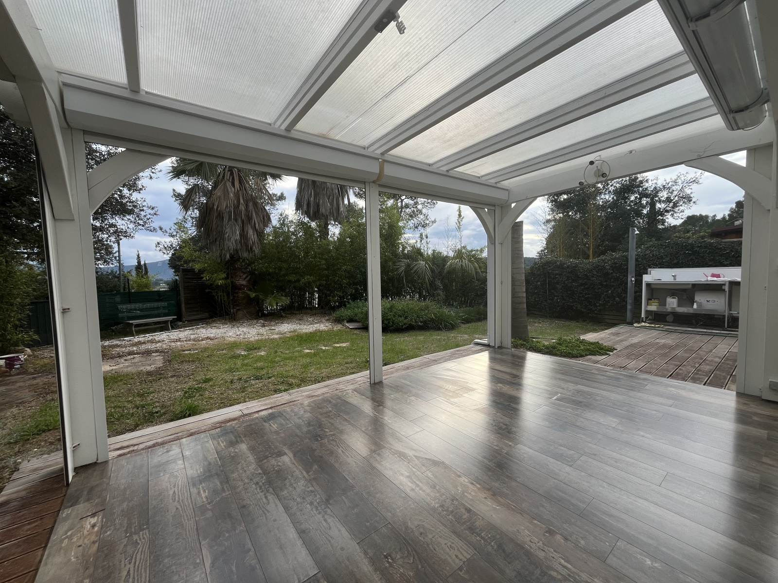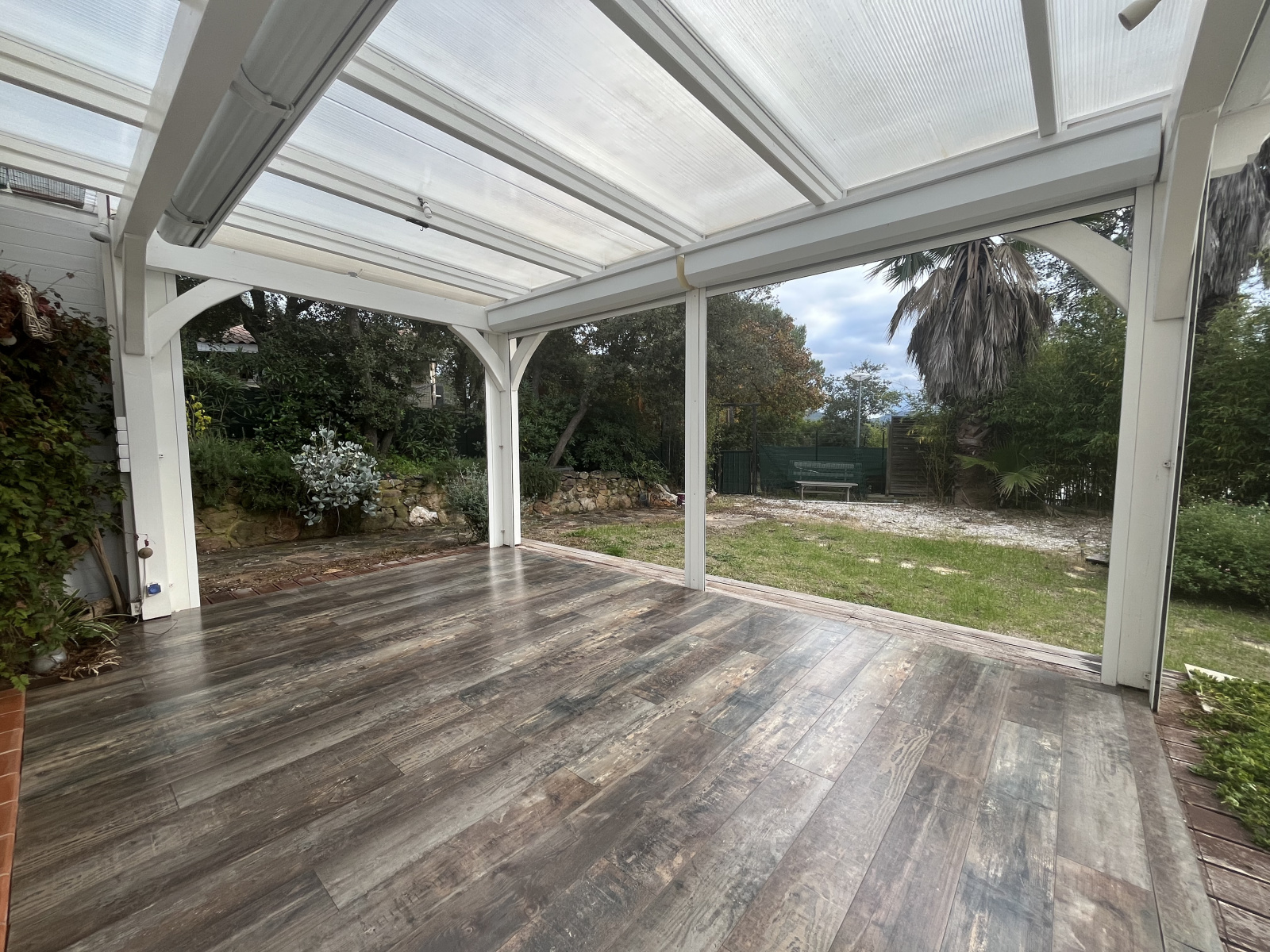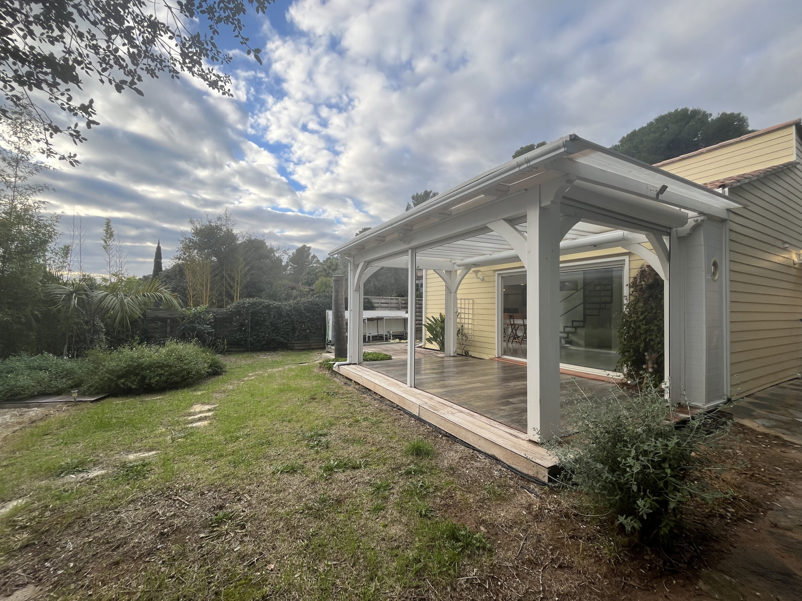 La partie extérieure propose une grande terrasse d’environ 17 m² pouvant être entièrement fermée par des stores électriques afin de créer une pièce supplémentaire, ainsi qu’une terrasse en bois non couverte d’environ 16 m². Le terrain, entièrement clôturé et arboré, représente environ 370 m² et accueille un petit bassin, une cuisine d’été ainsi qu’un abri de jardin. Le bien bénéficie de deux à trois places de stationnement (possibilité de garer un camping-car) et de l’accès au canal de Provence.