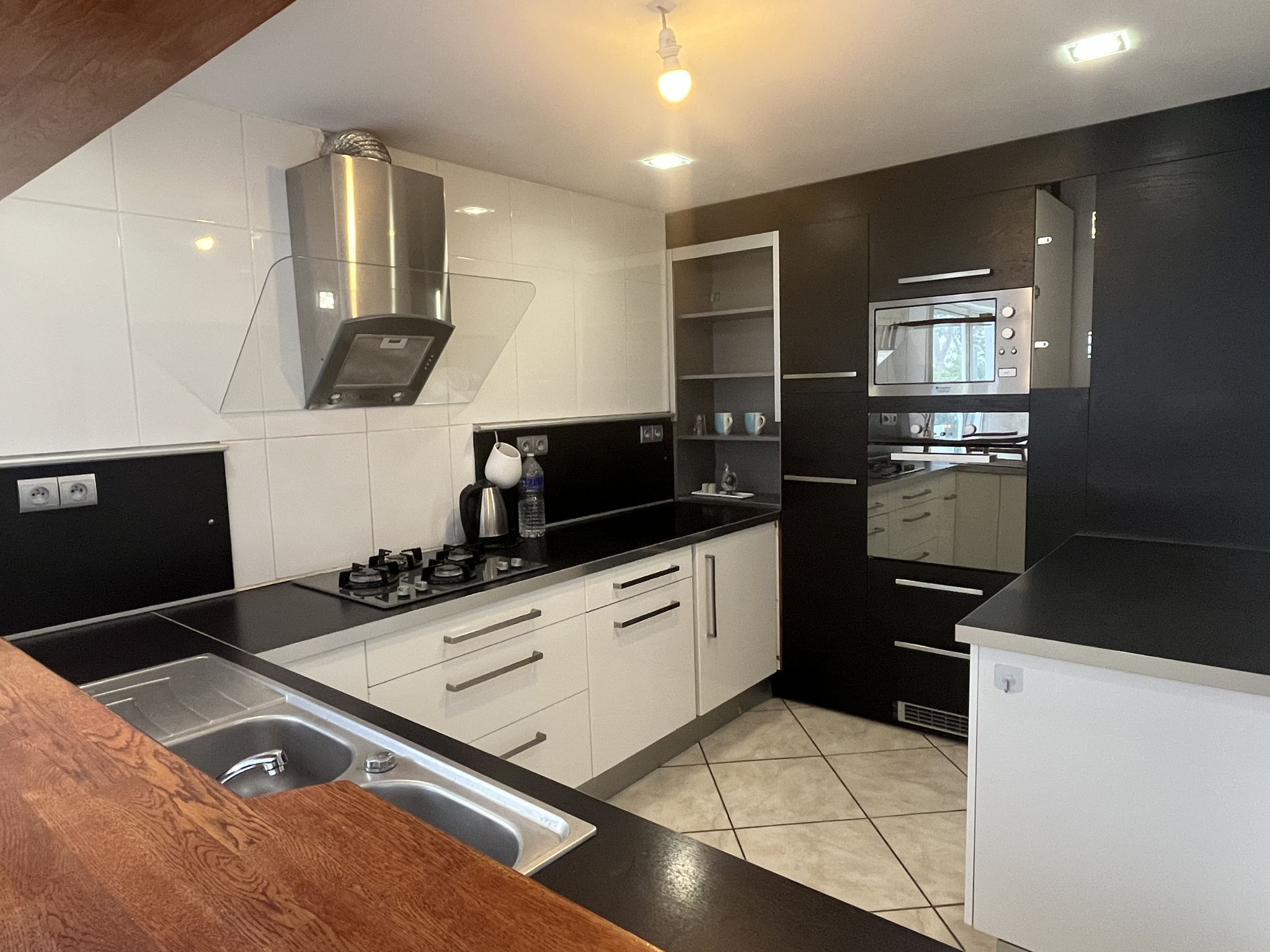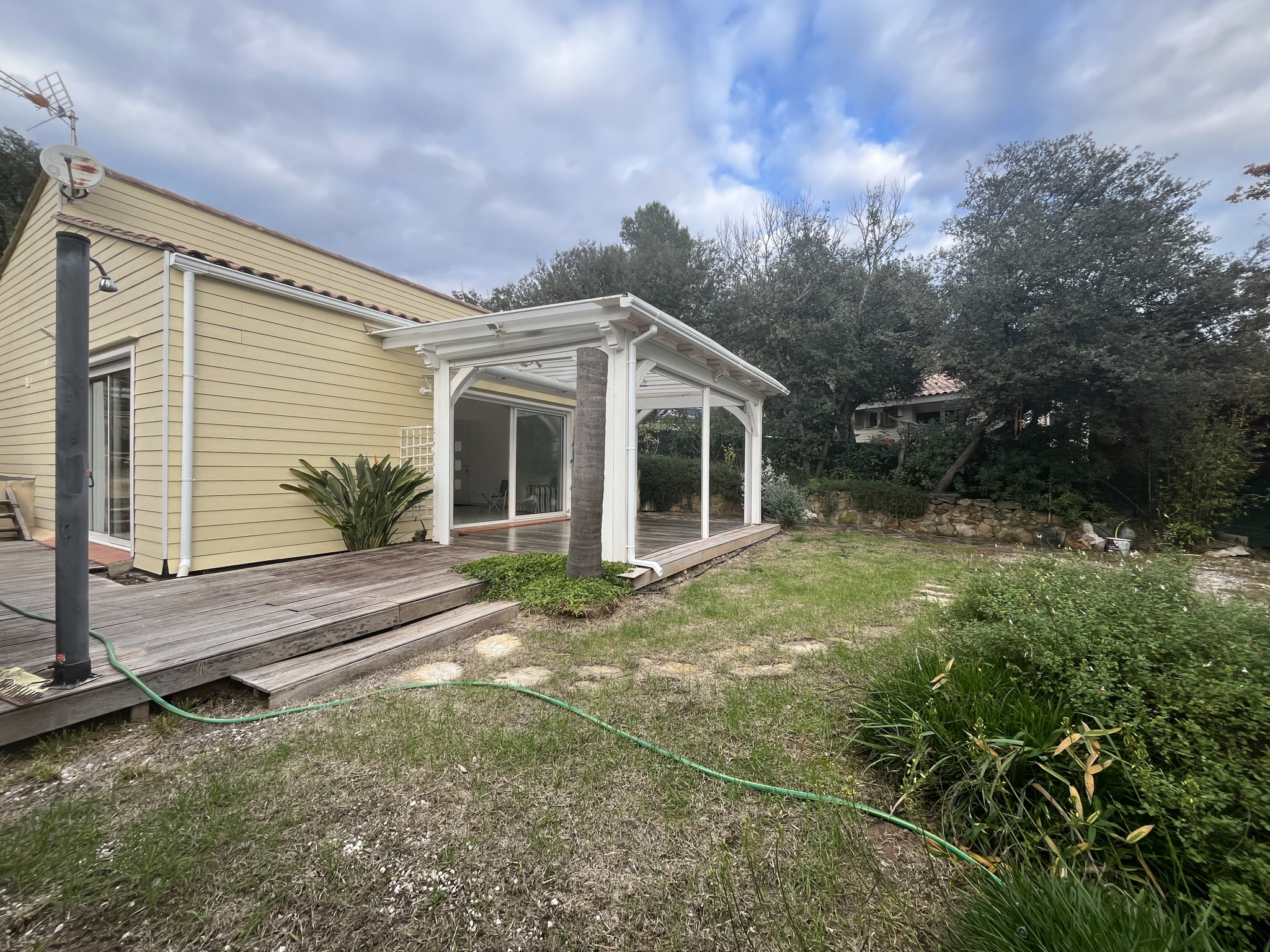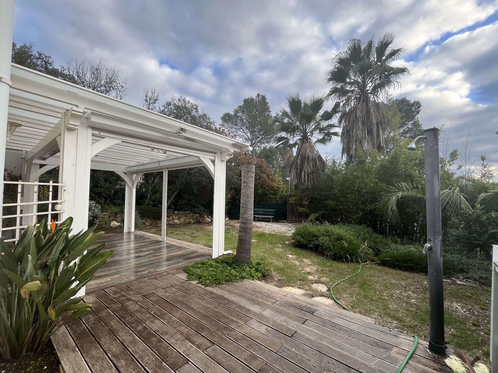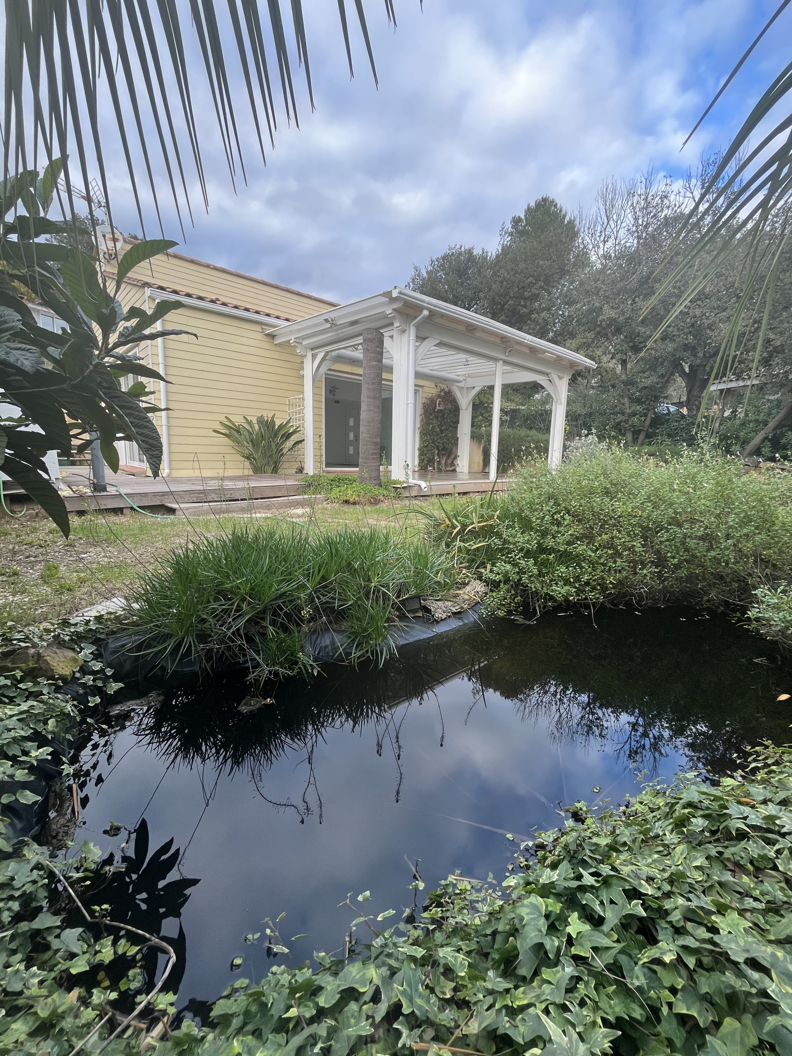 La partie extérieure propose une grande terrasse d’environ 17 m² pouvant être entièrement fermée par des stores électriques afin de créer une pièce supplémentaire, ainsi qu’une terrasse en bois non couverte d’environ 16 m². Le terrain, entièrement clôturé et arboré, représente environ 370 m² et accueille un petit bassin, une cuisine d’été ainsi qu’un abri de jardin. Le bien bénéficie de deux à trois places de stationnement (possibilité de garer un camping-car) et de l’accès au canal de Provence.