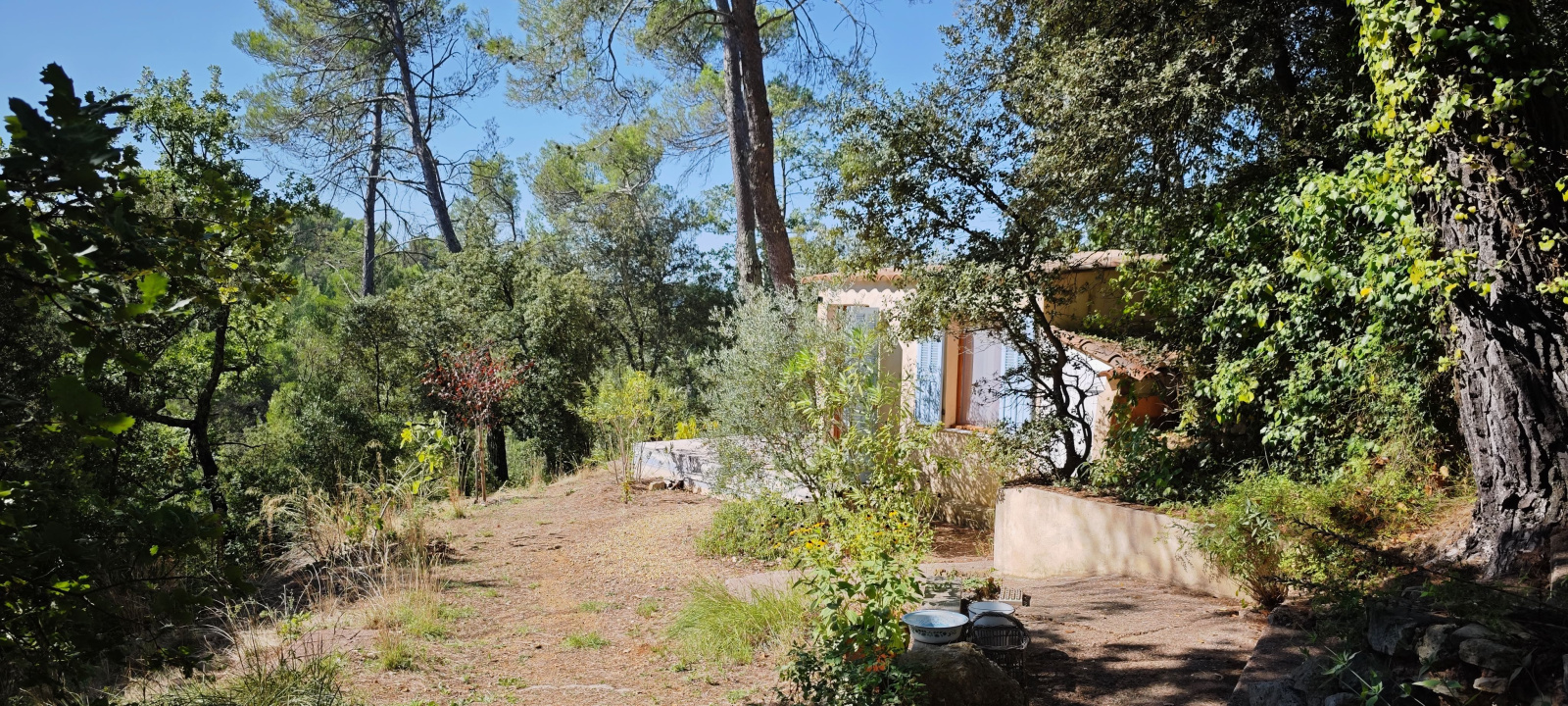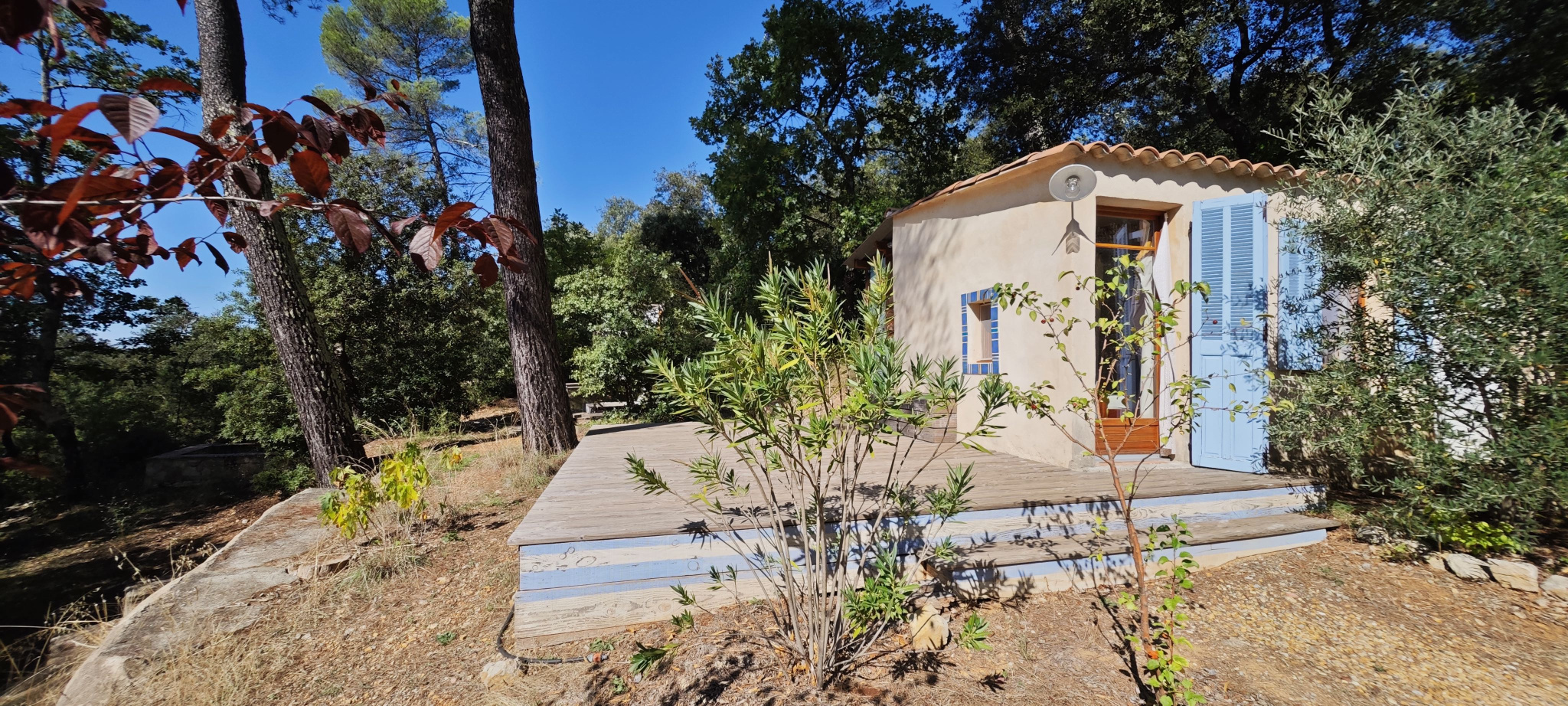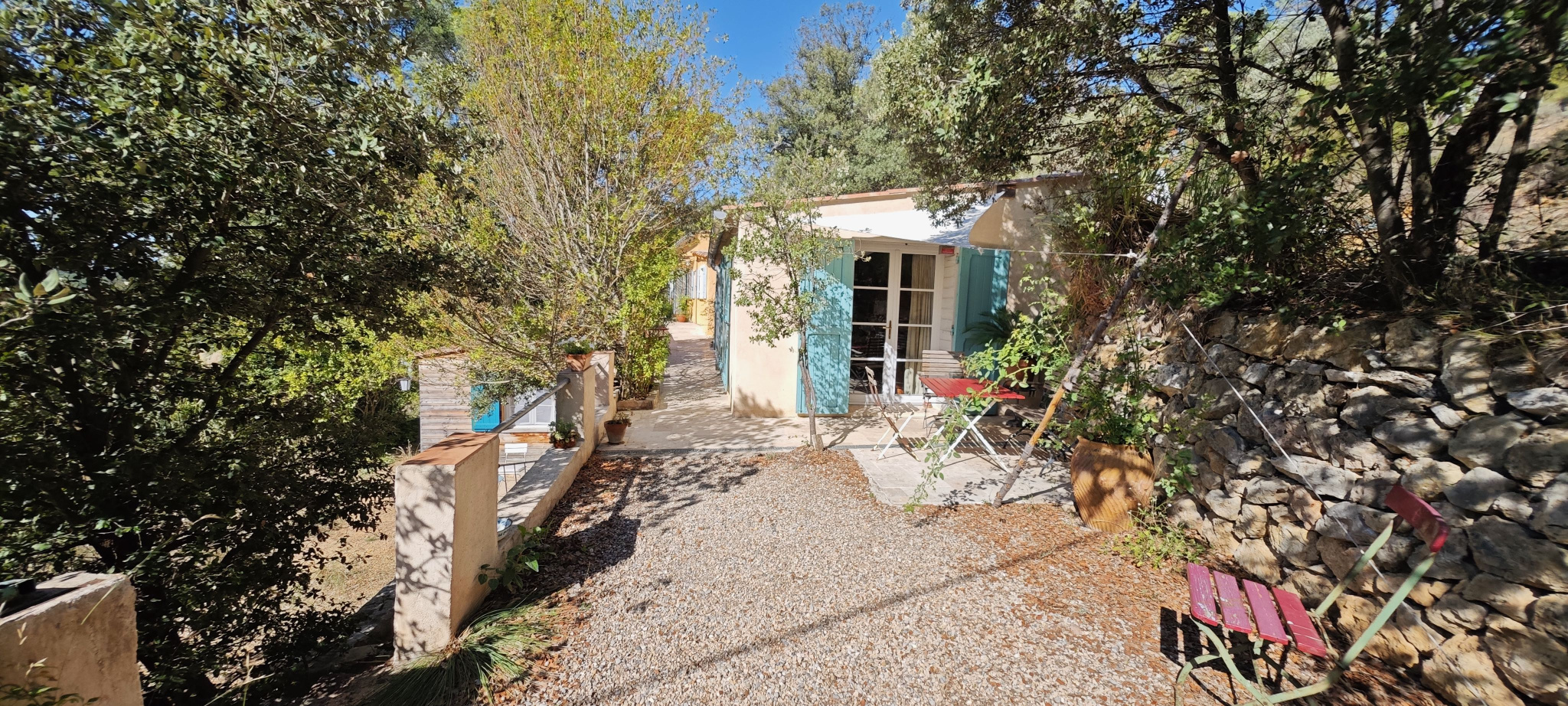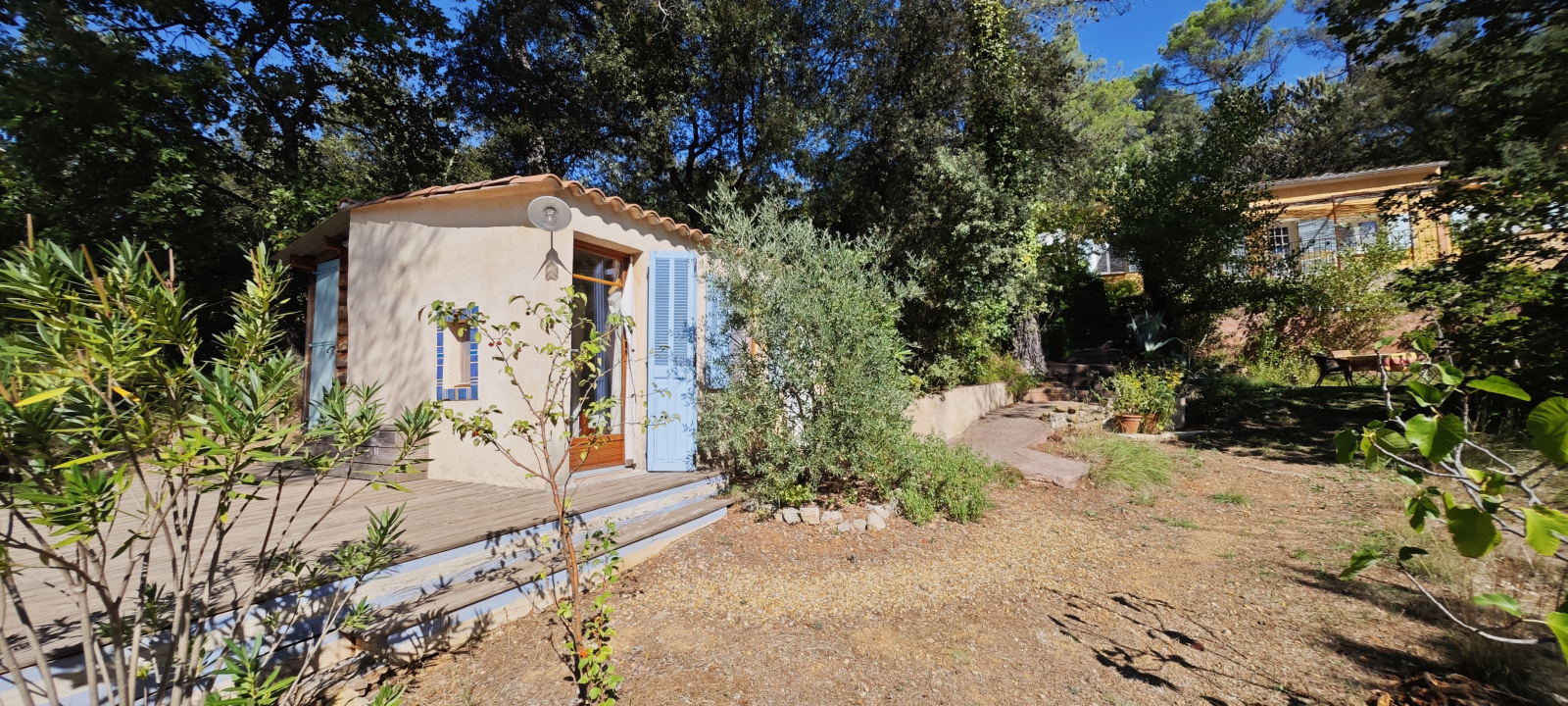 Barjols (83670)Nichée sur un terrain de 9 337 m² au cœur de la Provence Verte, cette propriété rare offre une vue imprenable sur la montagne de la Sainte-Baume. La maison principale de 72 m² propose une grande pièce de vie lumineuse avec cuisine équipée, cheminée et plafond cathédrale, deux chambres, mezzanine, WC indépendant et salle d’eau avec WC. Plusieurs dépendances rénovées complètent l’ensemble : un cabanon T1 habitable de 9 m² avec salle d’eau, un studio d’enregistrement de 28 m² (pouvant être transformé en logement), un T2 en construction bois indépendant de 23 m², ainsi que des annexes (carport, atelier, stand mobilhome, terrain de boules). Le tout dans un environnement naturel exceptionnel, à proximité d’Aix-en-Provence, Marseille et des Gorges du Verdon. Travaux récents, gîtes non attenants, calme absolu et potentiel d’accueil. Idéal pour projet familial ou touristique.